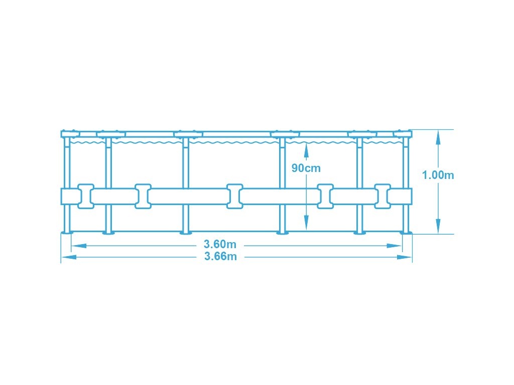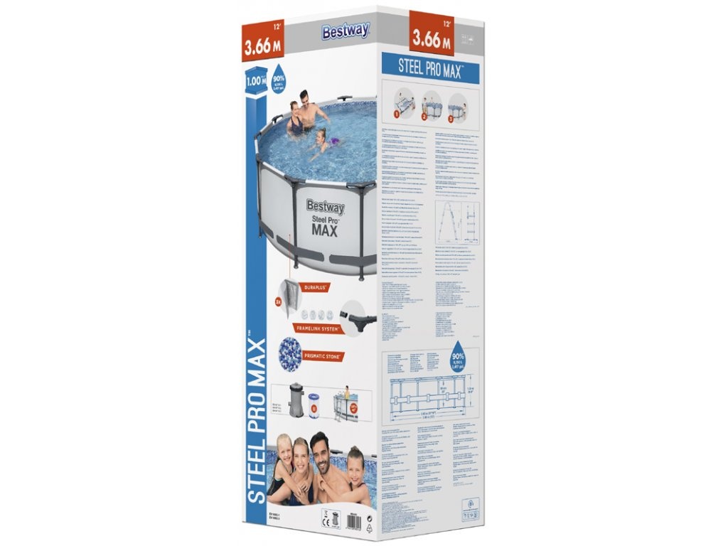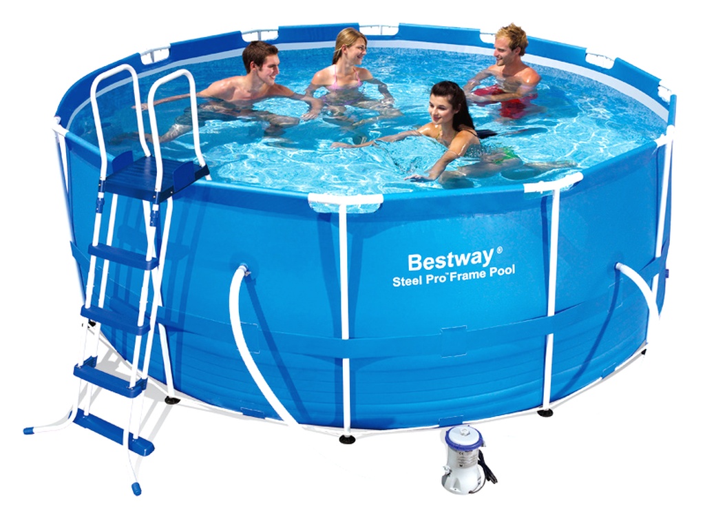 Nadzemní rodinný zahradní bazén od renomované italské firmy Bestway, se skládací kovovou konstrukcí a kartušovou filtrací. Stačí pouze sestavit kovovou konstrukci a bazén napustit vodou.