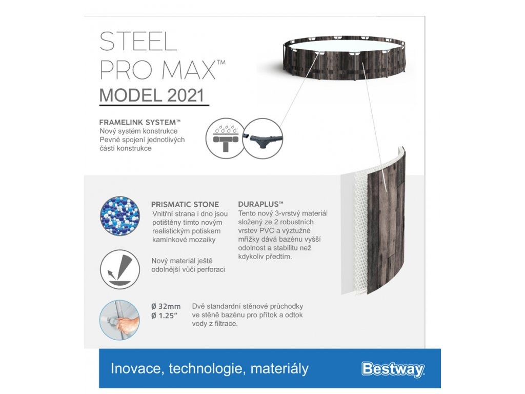 Mimořádně pevné stěny tohoto bazénu jsou konstruovány z materiálu Dura Plus™, což je 3vrstvý vyztužený materiál s polyesterovou mřížkou uloženou mezi dvěma vrstvami vysoce odolného PVC. Celková tloušťka stěny je 0,40 až 0,80 mm v závislosti na velikosti bazénu. Nabízí mimořádnou pevnost a odolnost.