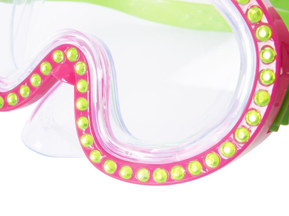 Plně nastavitelný hlavový popruh a dvojitě utěsněný límec zaručují optimální pohodlí při používání. Kromě toho mají brýle čočky s polykarbonátovým UV filtrem. Celý je zdobený třpytivými, vsazenými třpytivými kamínky. Brýle jsou určeny pro děti od 7 let. Popruh umožňuje úplné nastavení, takže maska se dokonale přizpůsobí hlavě dítěte.
