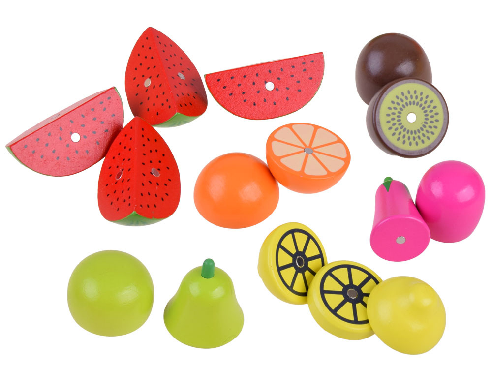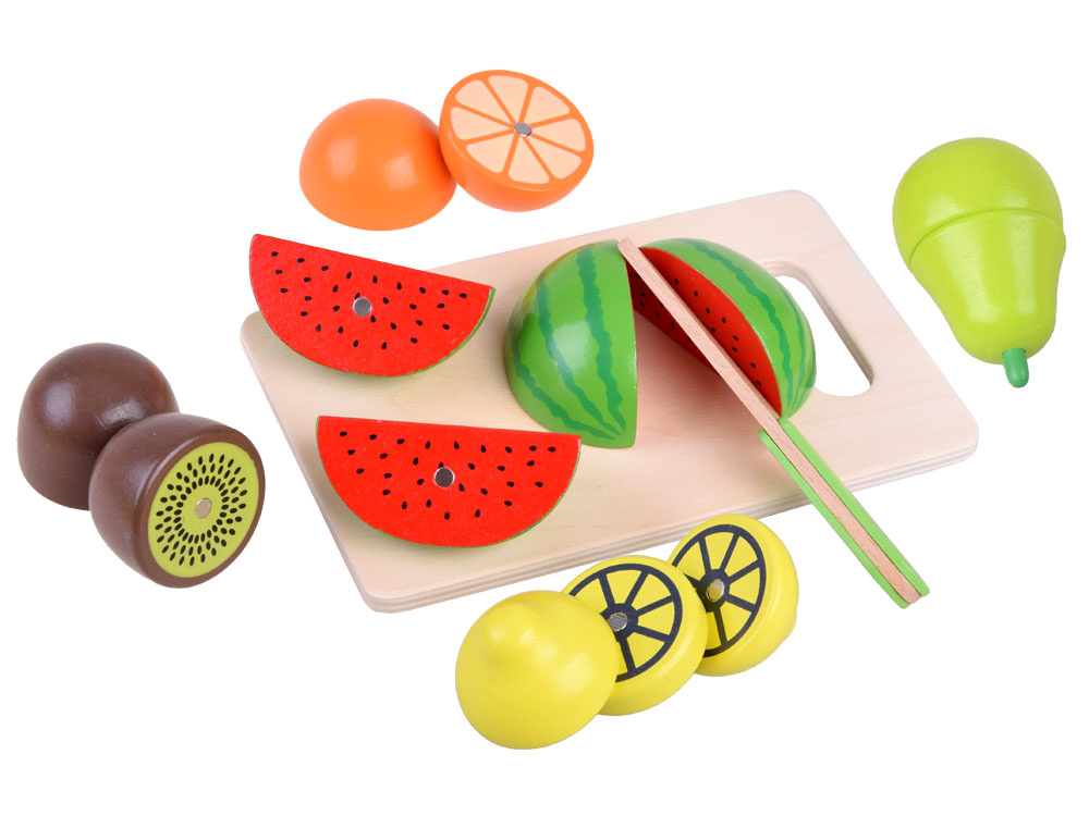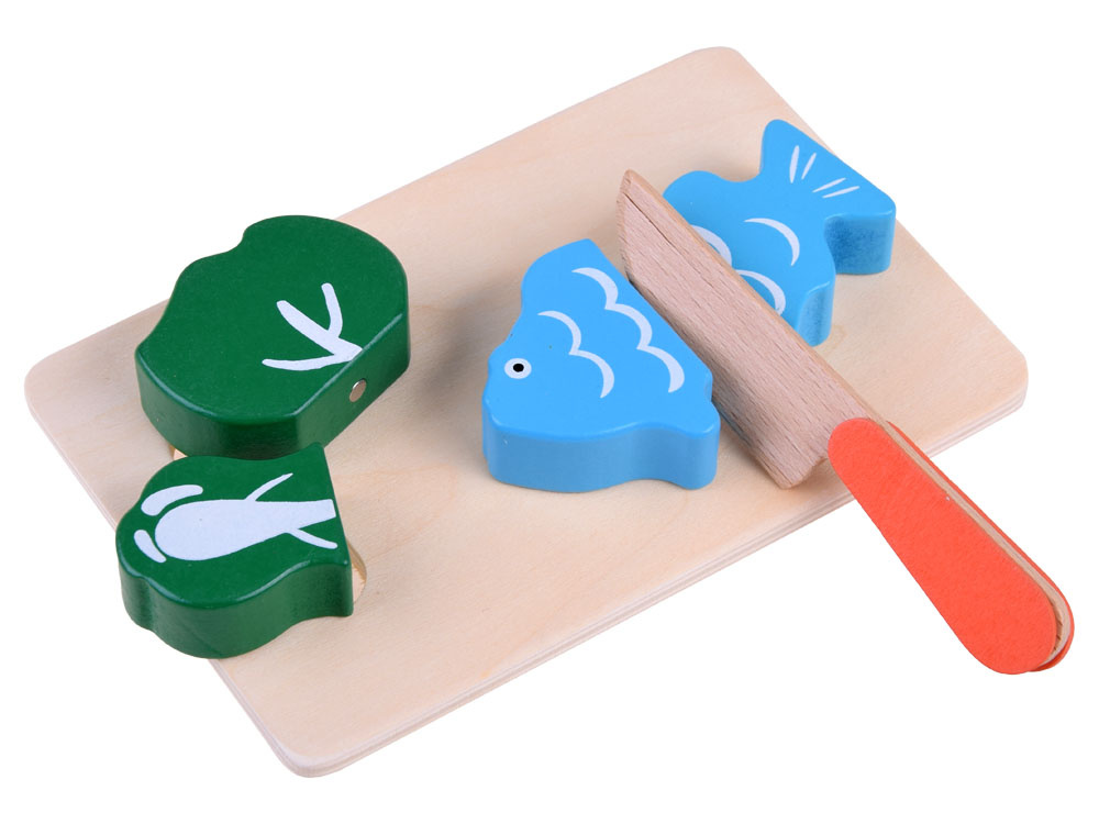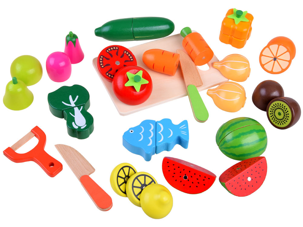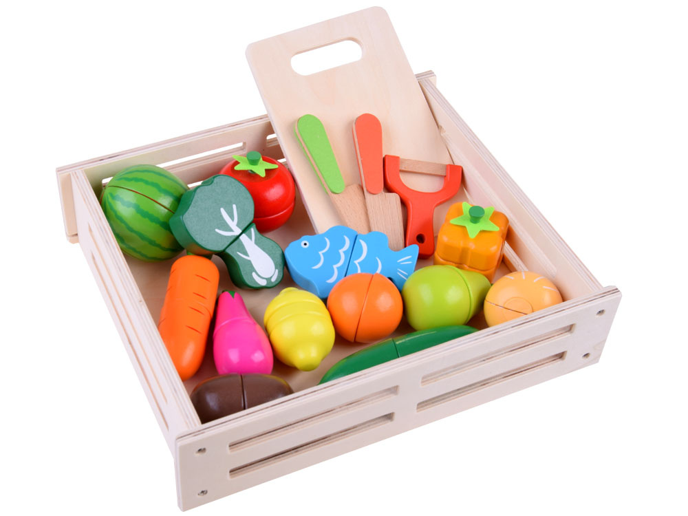 Dřevěná zelenina a ovoce ke krájení v přírodním boxu s prkénkem a bezpečnostními noži. Soubor přirozeně rozmnožených druhů zeleniny, ovoce a ryb přinese kulinářské revoluce. Děti rády napodobují dospělé a jejich každodenní činnosti, taková sada je pro ně výzvou. Zelenina, ovoce v půlkách mají připevněné magnety, takže se dají snadno rozdělit a dítě si může procvičit ruce tím, že je rozkrojí na půlky a meloun dokonce na čtvrtky. Skvělý způsob, jak povzbudit malé kuchaře ke hře.