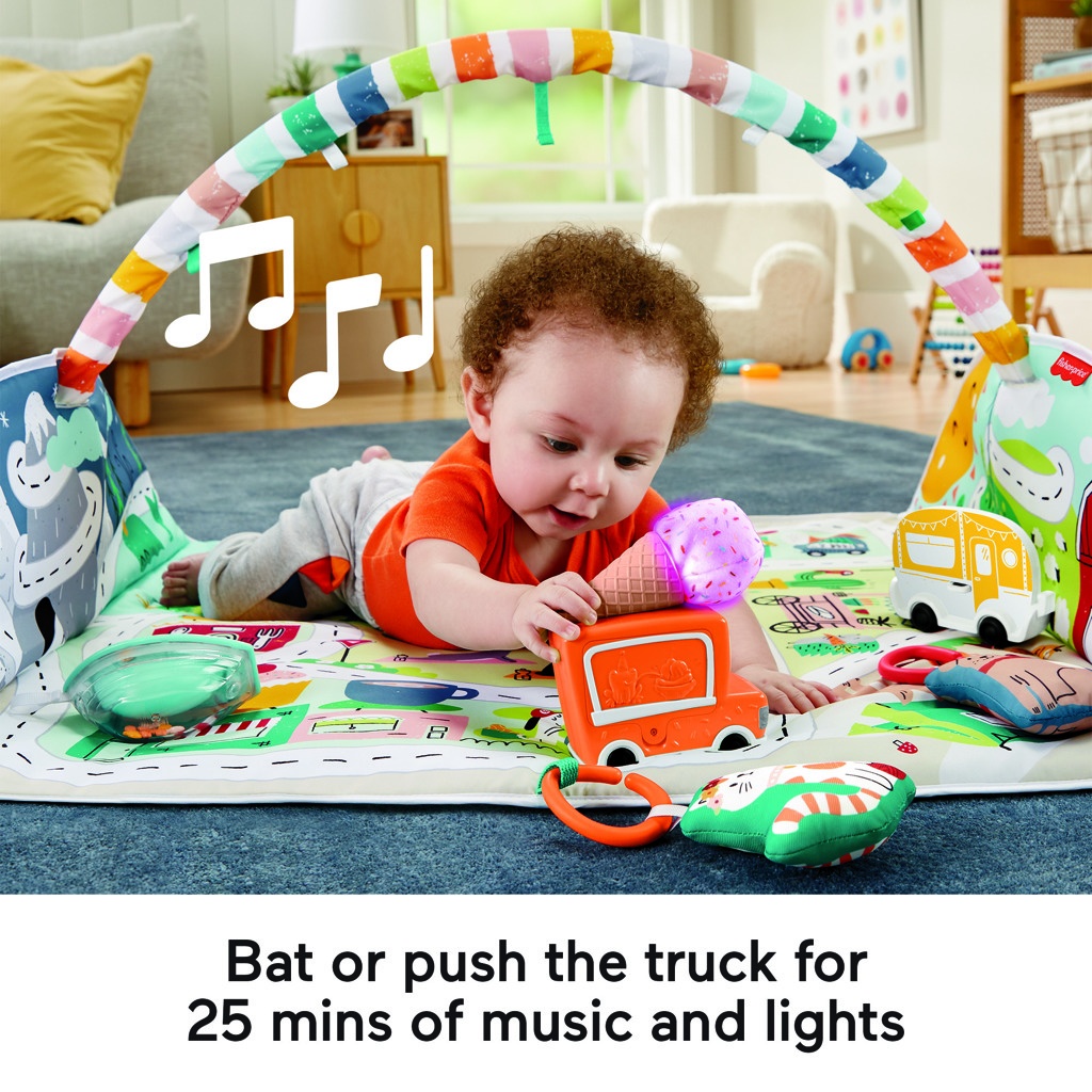 V tomto miminkovském městečku pejsci šustí, kočičky cinkají a lesklé karavany létají po obloze. Panda a lenochod jsou parťáci na cvičení a zmrzlinářské auto zásobuje zasněžené hory dobrotami. Fisher-Price® Hrací dečka s aktivitami nabízí téměř 120 cm místa pro vaše děťátko, které jej může prozkoumávat, zatímco leží a hraje si, pase koníčky nebo sedí a pozoruje vše kolem sebe. Dečka obsahuje 7 hraček včetně zrcátka a odolných hraček, které jsou připevněny k odnímatelné hrazdičce. A k tomu všemu ještě tahací zmrzlinářské auto, které přehraje až 25 minut hudby. Jak vaše děti rostou, dečka se stane dráhou, po které batolata mohou přesouvat vozidla z farmy přes zasněžené vrcholky hor až do města.