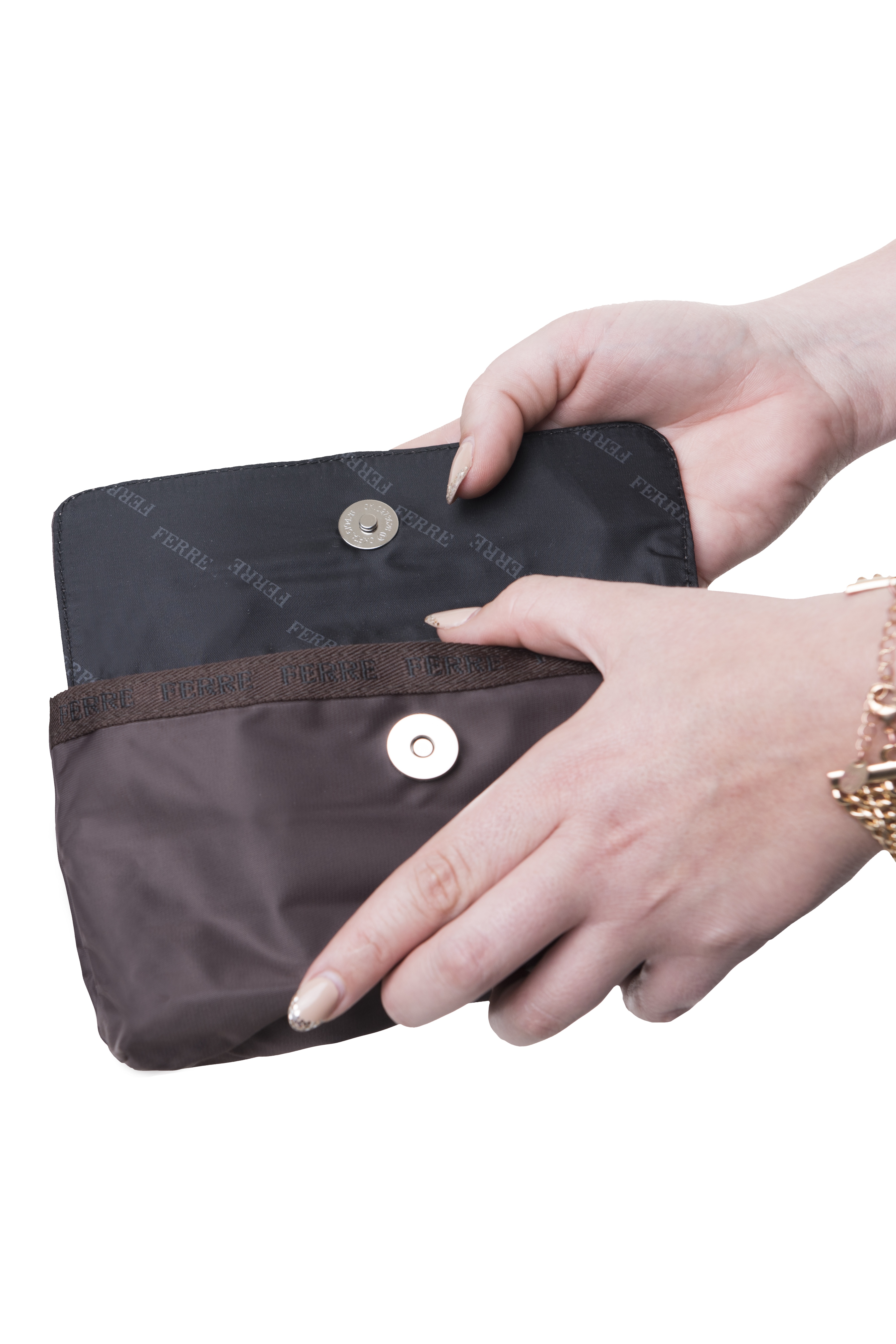 Praktická kosmetická taštička značky GF Ferre s cvočkovým zapínáním je vyrobena z lehkého materiálu, který se vám bude snadno udržovat.