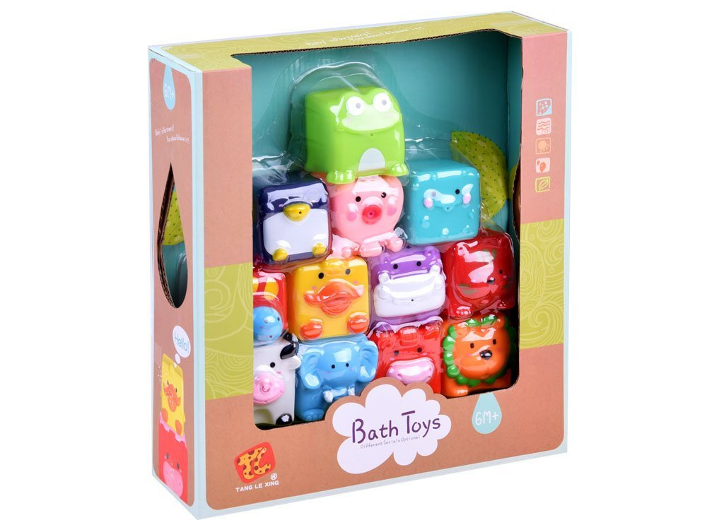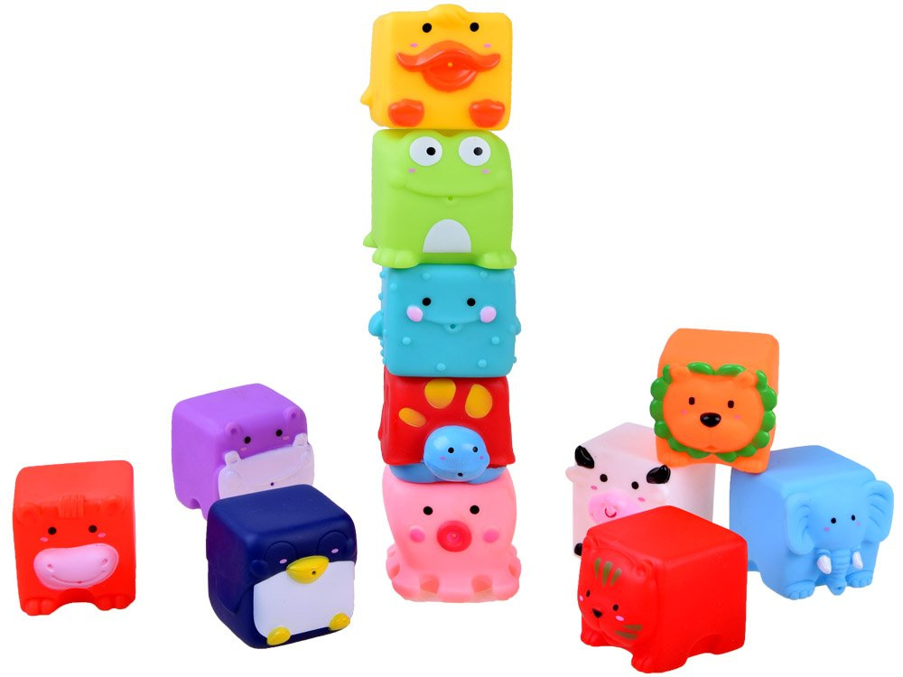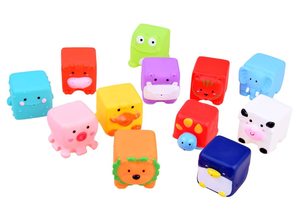 Barevná sada gumových zvířátek na hraní ve vodě se bude líbit každému dítěti. Hračky jsou vyrobeny výhradně z gumy s motivy zvířat. Mají otvory, aby s nimi dítě mohlo stříkat vodu. Hračky ve tvaru čtverce lze skládat na sebe a vytvořit tak pyramidu zvířat.