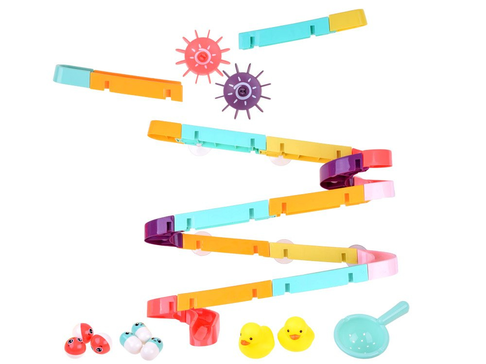 Sada je vyrobena z plastu a má silikonové přísavky, takže dráhu lze připevnit k obkladům v koupelně. Součástí balení jsou barevné dílky k sestavení točité dráhy, gumové kachničky, míčky, fazole a sítko. Při koupání může dítě vymýšlet fantastické hry s prchající kachničkou, honícím míčkem a válci, které lze přilepit vedle sebe, aby dítě mohlo točit oběma najednou. Sada se skládá ze 44 dílků, ze kterých si můžete postavit skluzavku.