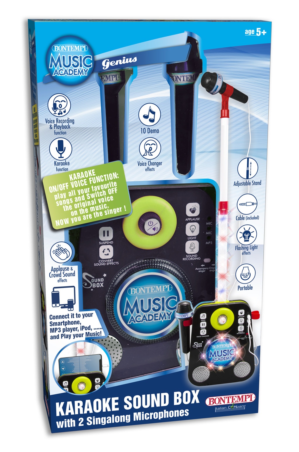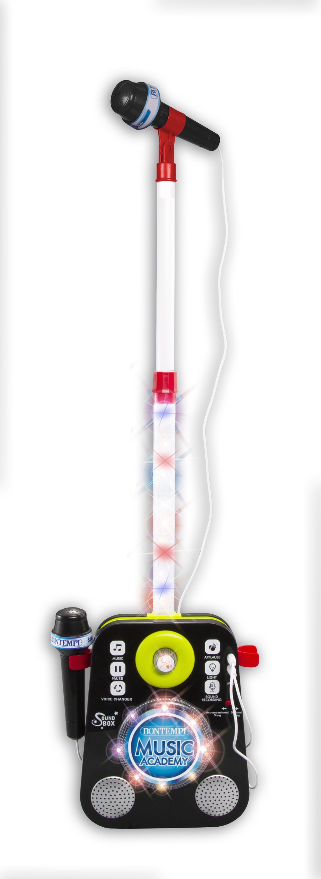 Karaoke s 2 mikrofony a hracím boxem má 2 nastavitelné mikrofony se světelnými efekty, přednastavených 10 demosongů, potlesk a vzuky fanoušků, aktivovací tlačítko na světelné efekty, nahrávání a přehrávání vlastních melodií,efekty měniče hlasu. Funkce Karaoke zeslabení zpěvu v písničkách abys mohl sám zpívat pouze s melodií. Připojení na MP3 přehrávač, chytrý telefon, iPod, CD přehrávač atd. obsahuje kabel.