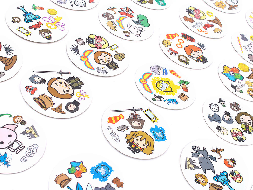 V krabici najdeš 55 kulatých karet, z nichž každá obsahuje osm různých symbolů ze světa čarodějů. Mezi libovolnými dvěma kartami se nachází přesně jeden společný symbol – může to být postava (např. Harry, Hermiona, Ron), předmět (např. hůlka, Zlatonka), tvorba (např. hipogryf) nebo erb jednoho z kolejí v Bradavicích.