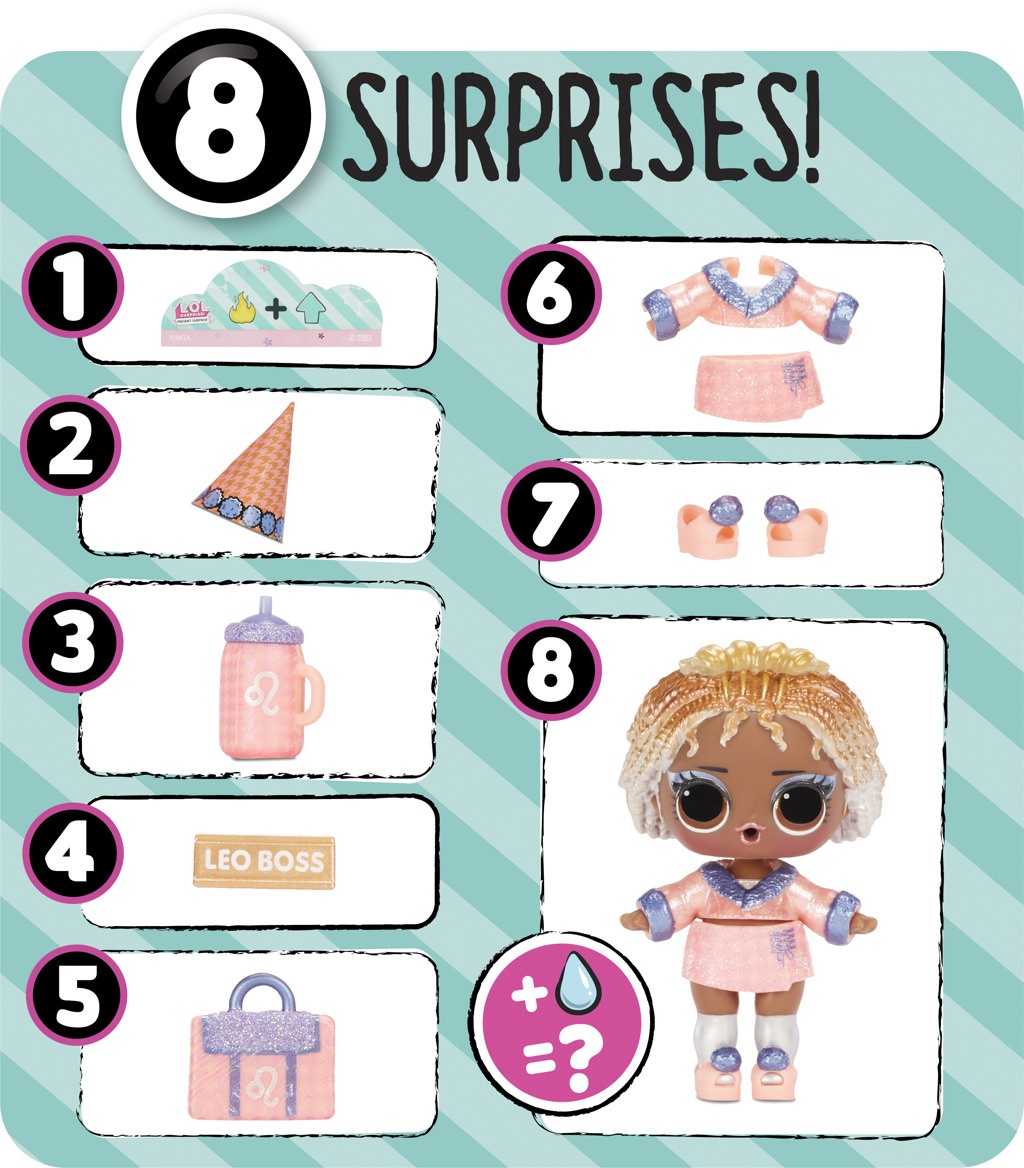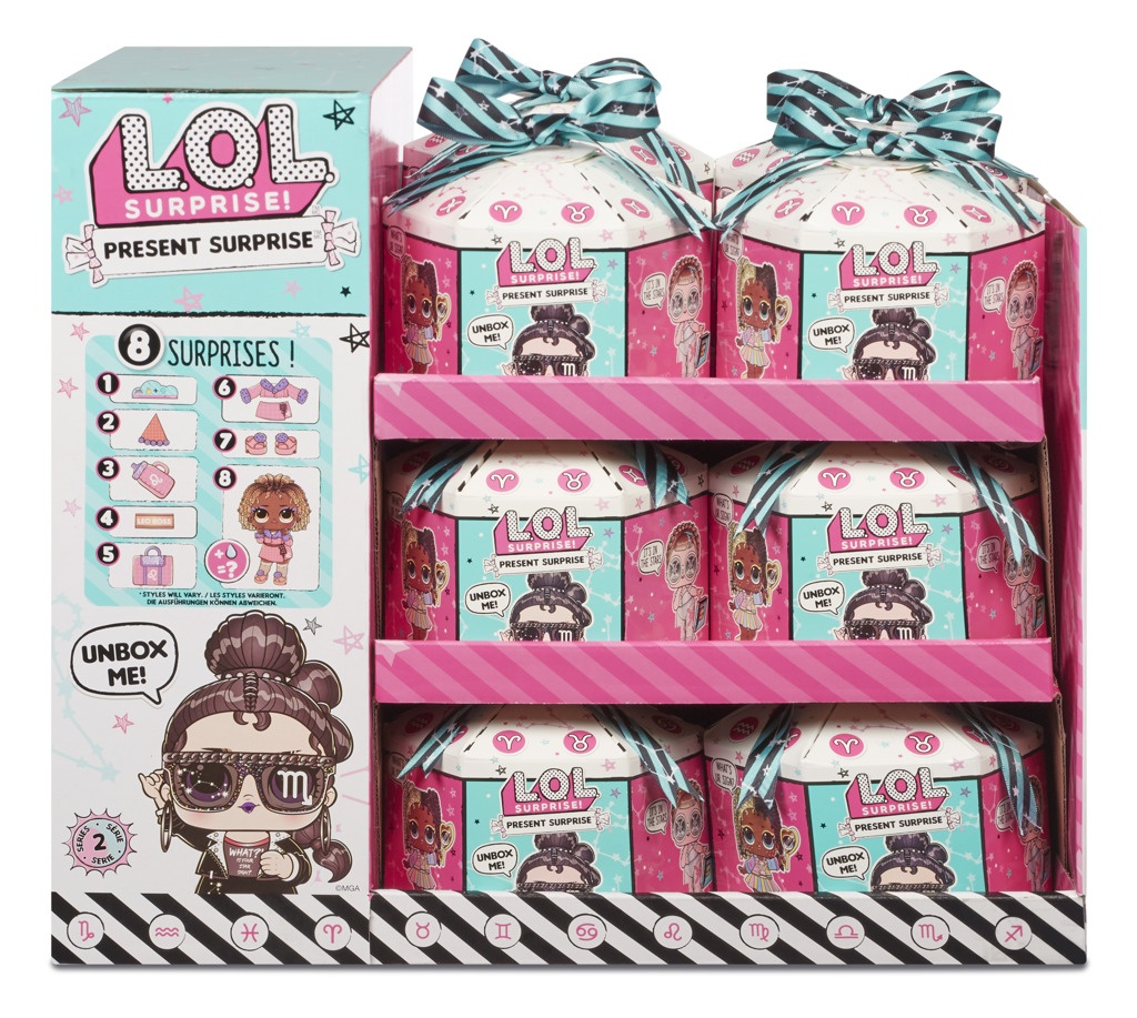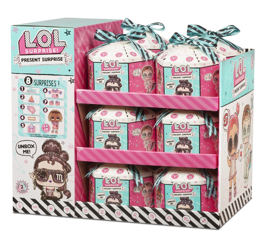 Obsah balení: • 8 překvapení • 1 L.O.L. Surprise! panenka se třpytivými vlásky • doplňky pro všechny L.O.L. panenky • třpytivý outfit • obal v podobě dárkové krabičky se stuhou a dárkovou visačkou • sběratelský plakátek