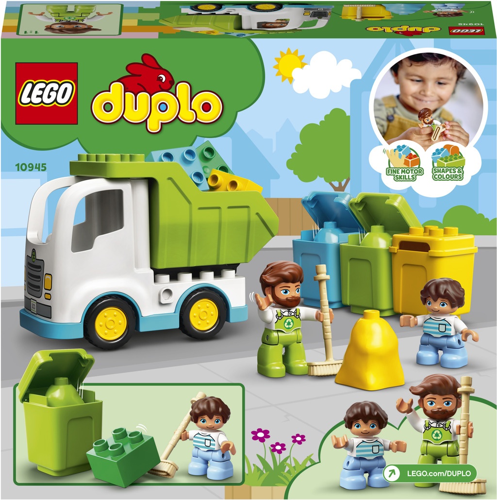 „• Všestranná stavebnice na motivy popelářů, která zábavnými aktivitami podněcuje hravé učení. • Ve stavebnici naleznete 2 DUPLO® figurky, popelářský vůz, 3 pytle, 3 popelnice a smeták. • Zatímco budou děti třídit odpadky, naučí se poznávat barvy a procvičí svou jemnou motoriku. • Skvělý způsob, jak s dětmi od 2 let společně prožívat vývojové milníky. • Stavebnici lze snadno nakombinovat s ostatními hračkami LEGO® DUPLO®. • Součástí návodu na stavění je také zábavný obrázkový příběh. • Všechny stavebnice LEGO® DUPLO® vedou děti k nápaditému hraní a podporují jejich vývoj. • Stavebnice LEGO® DUPLO® splňují nejvyšší oborové standardy kvality. • Kostky a dílky LEGO® DUPLO® splňují přísné normy týkající se bezpečnosti dětí.“