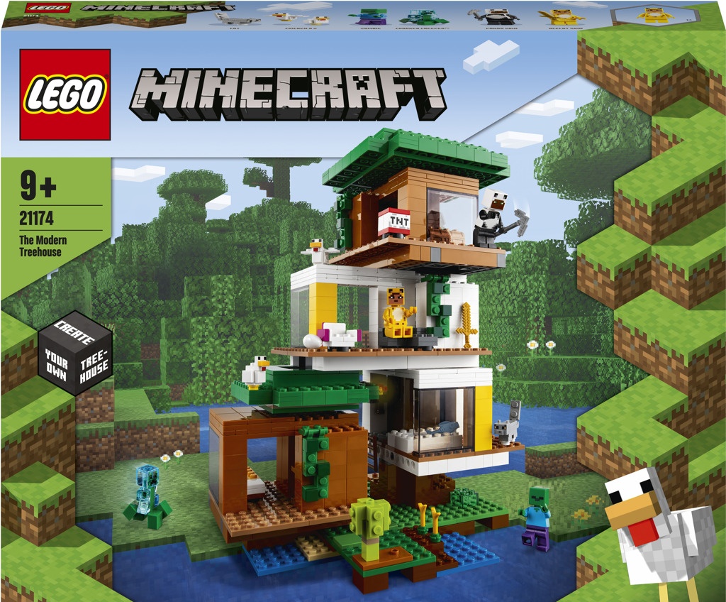 Děti si postaví 4 velmi odlišné místnosti – kuchyň, knihovnu, pracovnu a ložnici – a hotový model rozšíří o autentické doplňky ze světa Minecraft (od nábytku a ložního prádla až po nástroje a TNT). Sadu lze donekonečna přestavovat a objevovat tak ničím neomezené možnosti kreativního hraní. Jednotlivé pokoje dokonce vůbec nemusí být připojeny ke stromu. Stavebnice se ideálně hodí pro děti, jejichž představivost se nespokojí s tradičními domečky pro panenky." „• Moderní domek na stromě je působivý model z řady LEGO® Minecraft™, který lze neustále přestavovat. • Obsahuje nabitého Creepera, zombie, kočku, kuře, a k tomu navíc pandí a ocelotí skiny. • Nekonečné možnosti kreativního stavění a hraní. • Ideální pro všechny fanoušky hry Minecraft™ a stavitele od 9 let. • Stavebnice, která má přes 29 cm na výšku, přináší zábavu v epickém měřítku. • Mezi doplňky patří nástroje, nábytek a TNT. • Stavebnice LEGO® Minecraft™ nabízejí hráčům nový způsob, jak si vychutnat jejich oblíbenou hru. • LEGO® stavebnice splňují přísné oborové standardy kvality. • LEGO® dílky splňují náročné globální bezpečnostní standardy.“