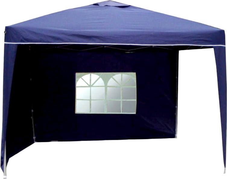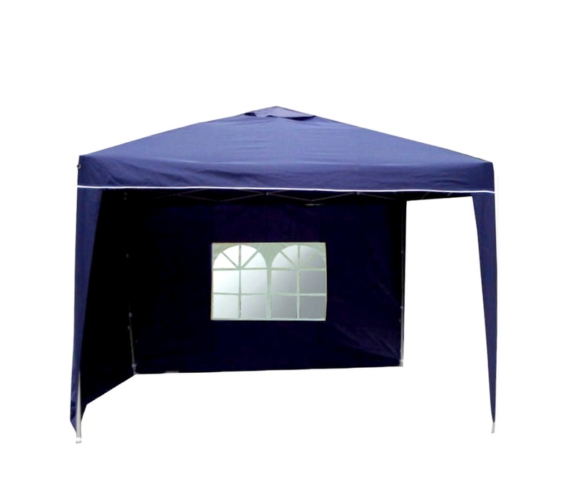Zahradní altán vybavený rychloskládající se nůžkovou konstrukci a dvěma bočními nepromokavými stěnami s jedním oknem.