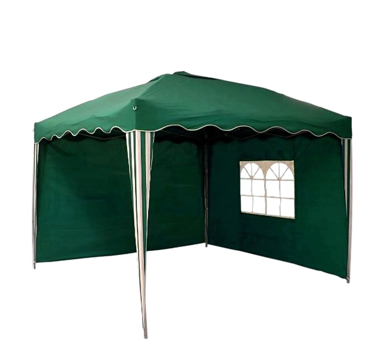 Zahradní altán vybavený rychloskládající se nůžkovou konstrukci a dvěma bočními nepromokavými stěnami s jedním oknem.
