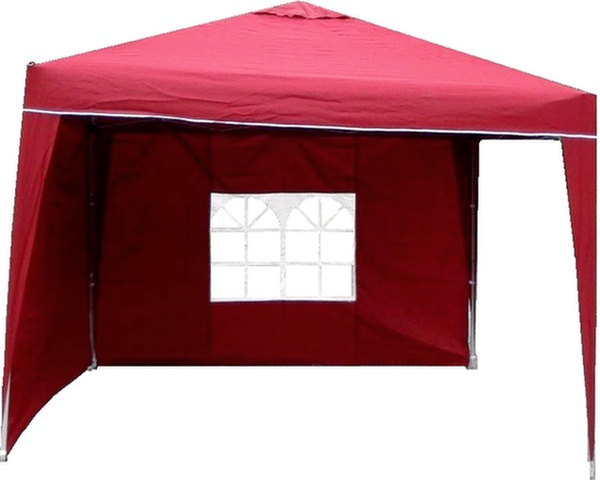 Zahradní altán vybavený rychloskládající se nůžkovou konstrukci a dvěma bočními nepromokavými stěnami s jedním oknem.