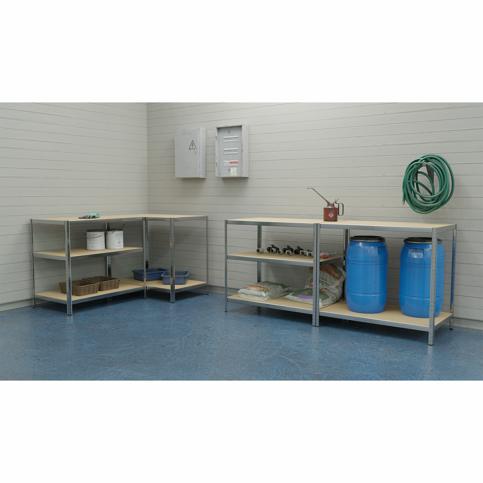 Tento kovový regál s MDF policemi najde využití všude tam, kde je potřeba přehledně a bezpečně uskladnit vybavení, zásoby nebo nářadí.