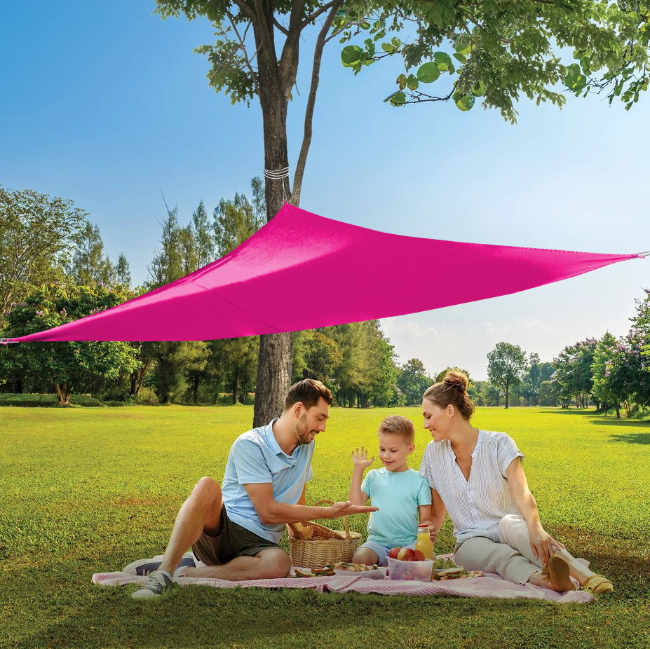 Vzhledem trojúhelníkovému tvaru a úchytných oček v každém rohu plachty je zavěšení stínící plachty velmi snadné.