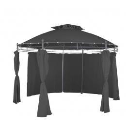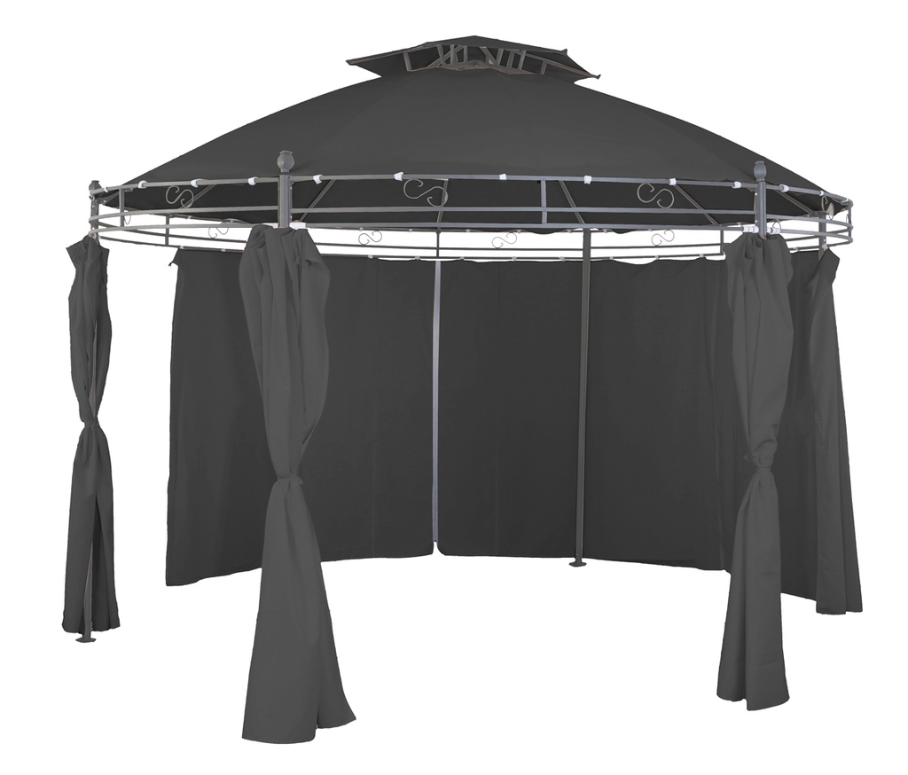 Zahradní altán vybavený pevnou a stabilní konstrukci, v kruhovém provedení, se stahovatelnými závěsy.