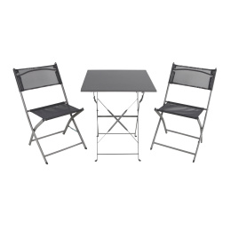 Sestava zahrnuje 2 křesla a stůl v šedé barvě. Zahradní stolek má kovový rám a skládací mechanismus kostry, díky tomu můžete stolek velmi rychle rozložit nebo složit.