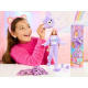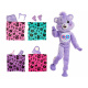 V sadě se nachází až 10 překvapení: kromě panenky a kostýmu najdeš sukýnku, čelenku, sluneční brýle, botičky, hřeben s houbičkou a miniaturního fialového medvídka.