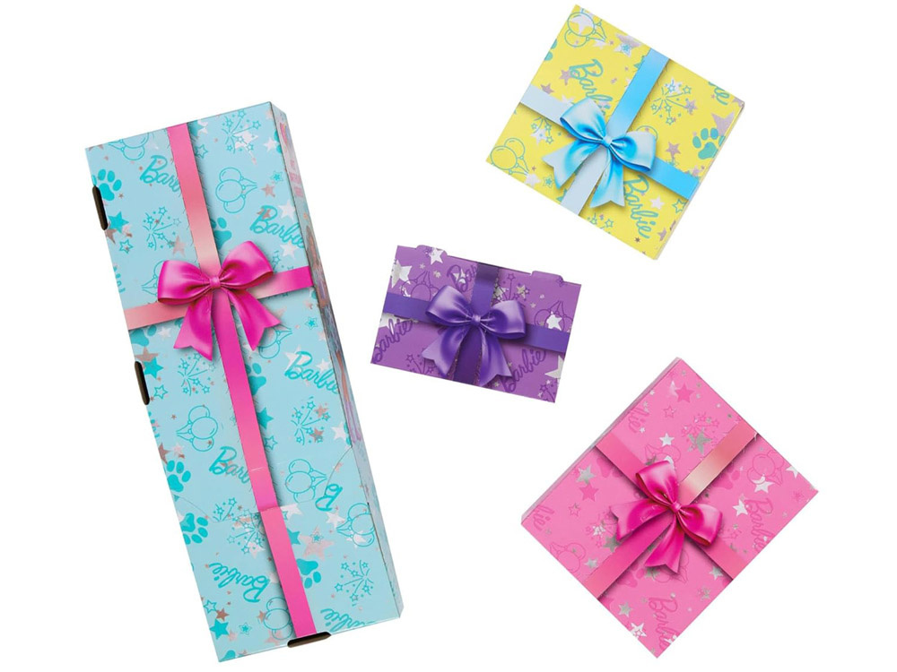 V této verzi sady se nachází brunetka Barbie® s modrými pramínky, oblečená v lesklých šatech ozdobených metalickými, fialovými hvězdičkami, ke kterým jsou sladěné fialové botičky.