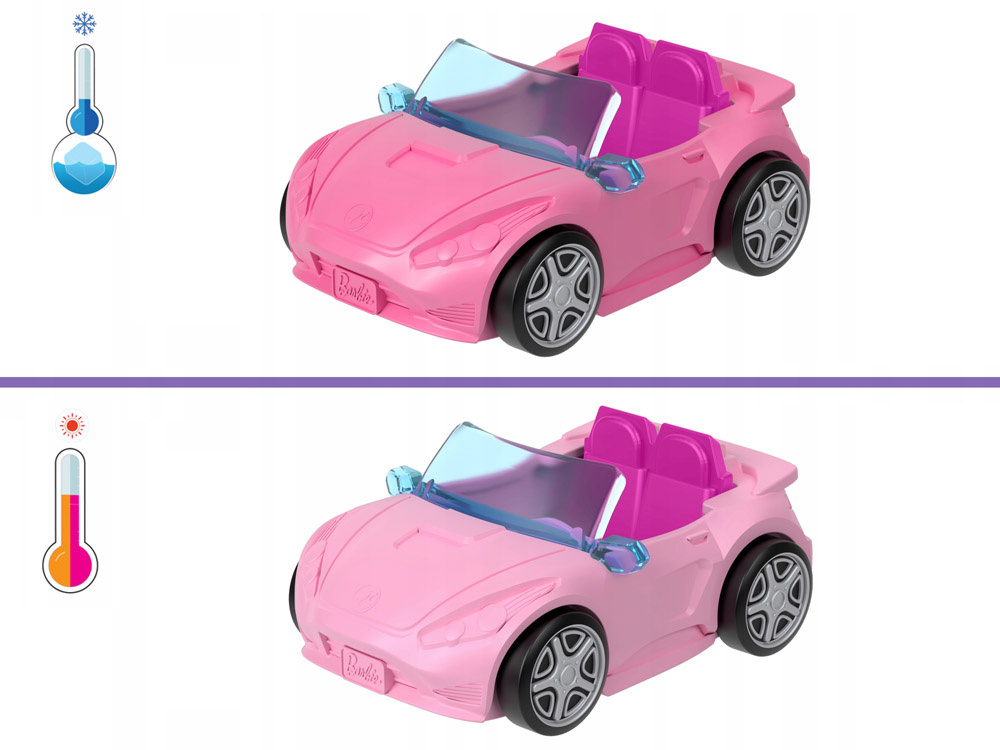 Kabriolet bez problémů pojme 2 mini panenky z této série. Navíc autíčko po ponoření do ledové vody změní barvu! Dáváš přednost jeho původnímu vzhledu? Není problém, stačí ho ponořit do teplé vody, aby se vrátil do předchozí verze. Změna funguje opakovaně, takže zábava nemusí mít konce. Jakým autíčkem dnes pojede tvoje oblíbená Barbie?