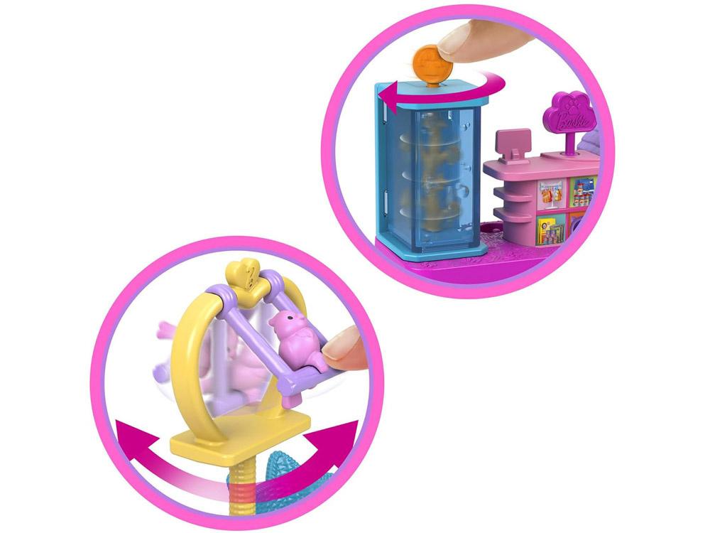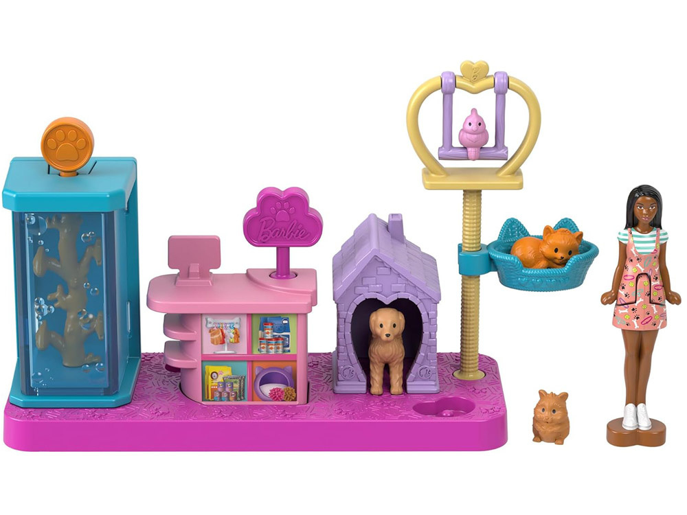 V sadě se nachází mini panenka Barbie, ideálně přizpůsobená rozměrům celé konstrukce. Doprovázejí ji figurky zvířat – pes, kočka, křeček a papoušek – které obohacují možnosti hry a povzbuzují k vytváření scén spojených s péčí o mazlíčka.