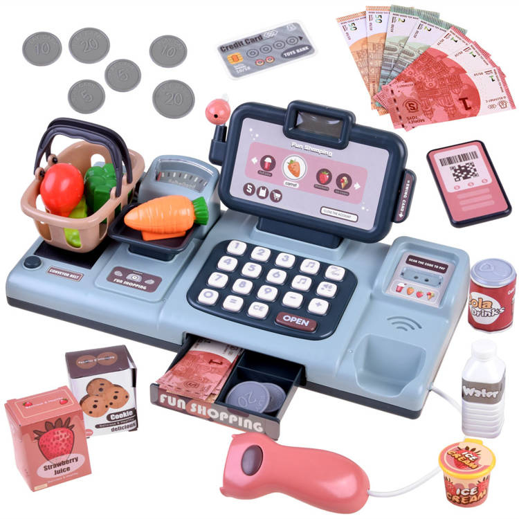Fiskální pokladna je základním vybavením každé cukrárny, prodejny potravin, více poboček atd. Hra na obchod a prodavače patří mezi oblíbené hry malých dětí. Pokladna má softwarové tlačítko kalkulačky pro sčítání, odčítání a sčítání. Pokladna je vybavena displejem LCD, na kterém se zobrazují číslice. Tlačítka u pokladny a čtečka potravin se zvukem umožňují profesionální obsluhu zákazníků. Čtečka skenuje zboží stejně jako ve skutečném obchodě. Jednoduše položte výrobek na skener, stiskněte tlačítko na skeneru a uslyšíte zvuk skenovaného výrobku. Na displeji se zobrazí částka za naskenovaný výrobek, stačí stisknout tlačítko (+) a můžete pokračovat ve skenování zbývajících výrobků. Pokladna je vybavena terminálem, takže náš malý zákazník bude moci po nákupu a shrnutí (= ) zaplatit hotově, kartou nebo dokonce chytrým telefonem, stejně jako rodiče v obchodě. Pokladna je navíc vybavena váhou a pásem, na který může zákazník položit svůj nákup. Páska se pohybuje stisknutím tlačítka. Hra na prodavače, obchodníka a obchodníka je vždy vzrušující a poučná.