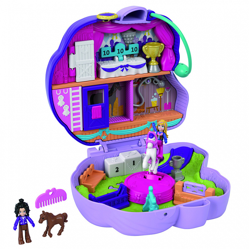 Je čas na dobrodružství s Polly Pocket™ a malými tlapkami! Dokonale se hodí pro hraní doma i na cestách. Větší přenosný kufřík Jumpin' Style™ Ponny má tvar roztomilého koníka a po otevření v něm najdeš minisvět s koňskou přehlídkou. Děti si zamilují odhalování překvapení skrytých v kufříku i minipanenku Polly™ a její kamarádku, které mají 5 pohyblivých kloubů, aby mohly být při hře v různých pozicích. Mají také 2 zábavné koňské kamarády (1 má sedlo a skutečný ocas), a navíc i skrytý hřeben! Otevři posunovací dveře do stodoly, vyveď koně ven a vezmi ho zkrášlovacího salónu. Zábava začíná! Hned poté nastává čas na procvičení skoků (jednu z překážek odhalíš rozložením části kufříku) a na drezuru koně na pódiu – můžeš s ním otáčet a koně všem předvést! Pak můžeš jít nahoru pro vyhodnocení výkonu koně – otoč kartami s čísly a odhal 10 bodů od každého sudího. Skvělý výkon! Pak už stačí vyzvednout si trofej za 1. místo! To byla ale úžasná soutěž! Součástí kufříku je řemínek pro přetažení kolem zápěstí, aby si děti mohly vzít své dobrodružství Polly Pocket™ kamkoli s sebou! Barvy a provedení se mohou lišit.
