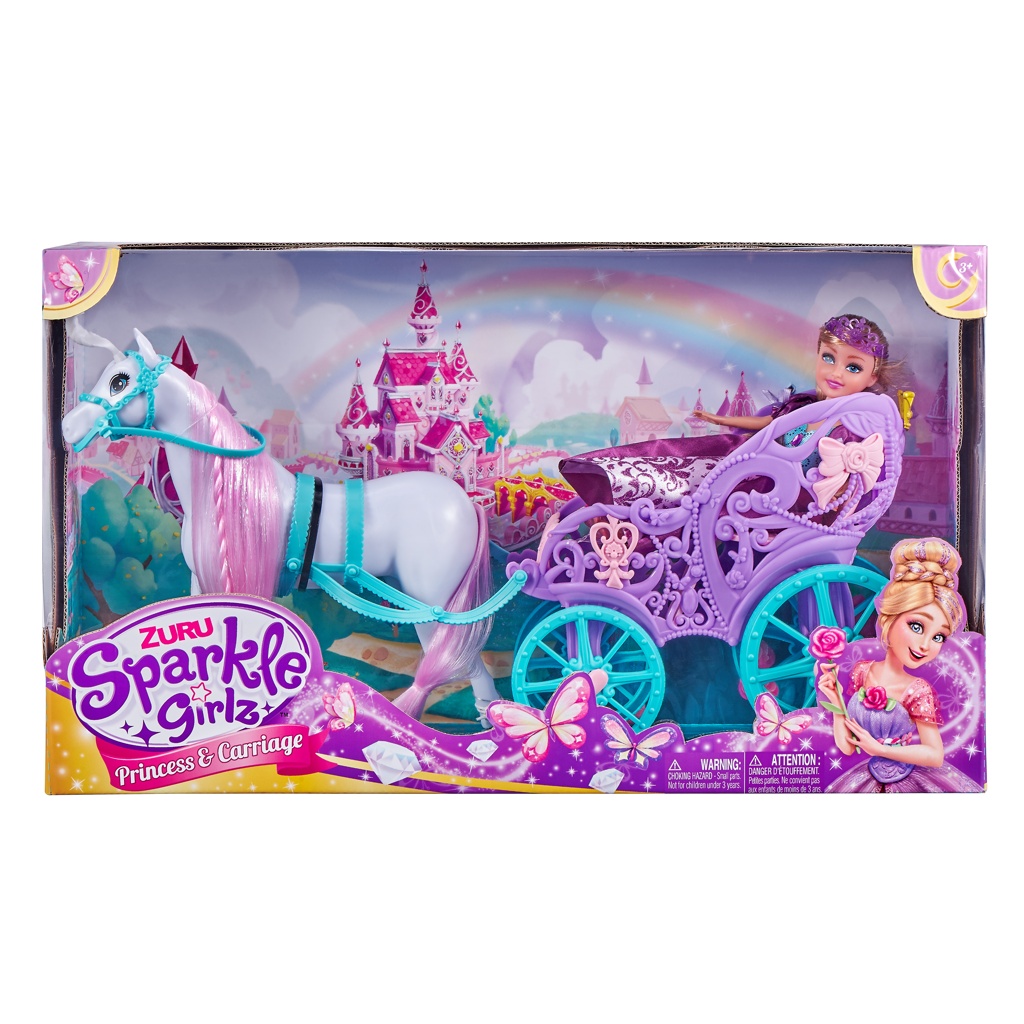 Princezna Sparkle Girlz, která má překrásné šatičky a je veliká 28 cm. Součástí sady je kůň a kočár.