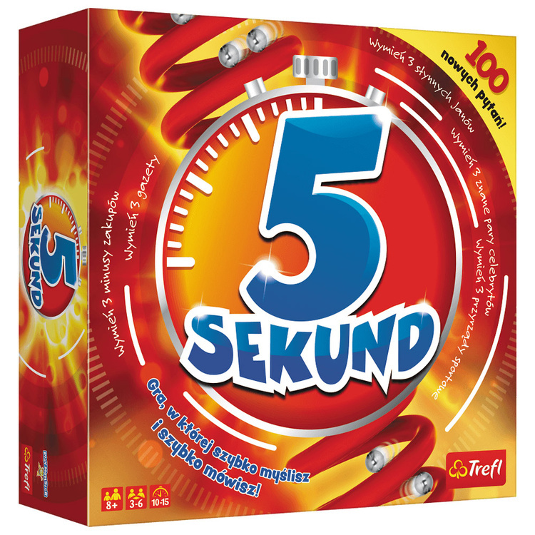 5 Sekund je dynamická a zábavná společenská hra, která testuje rychlost myšlení a reakce hráčů. Pravidla jsou jednoduchá a samotná hra je plná emocí a smíchu. Cílem hry je poskytovat rychlé odpovědi na různé otázky během pouhých 5 sekund!