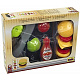 Sada na výrobu hamburgerů. Vytvořte si hamburger. Nakrájejte zeleninu nožem na prkénku a položte ji na sendvič s hamburgerem a omáčkou. Obsah: 1 prkénko 1 nůž 1 chléb 1 hamburger 1 plátek sýra 1 láhev omáčky 2 druhy zeleniny.